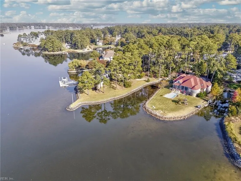 This home features water views from nearly every room, beautifully situated in the Birdneck Point and Cavalier Golf and Yacht Club community on Linkhorn Bay. Designed by noted David DeBord and the current owner. The French Norman-style home is warm and welcoming. Composed of unique materials and incredible attention to detail, this exceptional home offers a gourmet kitchen with multiple islands and an eat-in area, as well as relaxing areas with tranquil views of Linkhorn Bay. This 4,000 square foot home includes 2 en-suites, a Jack & Jill, 5 bathrooms, a finished room over the garage for workout space, a recreational room, or a guest room on nearly an acre. With lovely unique marble countertops throughout the home, custom cabinetry, all leading to spectacular views, gleaming wood floors, oak finishes, vaulted ceilings, 4 car garage, a gunite saline pool and a boat lift, this home truly ...
