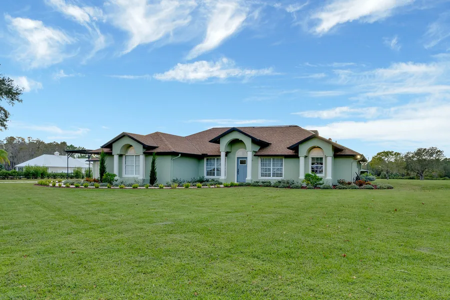 This stunning property features a 2,327-square-foot, 4-bedroom, 2-bathroom luxury home on 10 acres of beautiful completely fenced, cleared, usable land. Included on the property is a bass-stocked pond, and an additional 400-square-foot detached, updated, guest/in-law suite with 1 bedroom/1 bath and kitchenette. The one-story ranch home features an open concept split bedroom floor plan, wood-burning fireplaces in the master bedroom and living room, formal dining, office, vaulted ceilings, designer closets, updated bathrooms and kitchen with island, granite countertops and tons of storage. Two stainless steel hot water heaters with lifetime warranties were recently installed. The exterior of the main house, guesthouse and barn were recently painted. The home was re-piped in 2017 and a state-of-the-art, whole-house reverse osmosis water filter system was added. French doors in the living room and master bedroom lead to the large covered patio with an outdoor kitchen, newly re-surfaced and re-tiled screened-in pool, new pavers and views of the amazing picturesque sunsets. The property is entered through a private gate which continues down the long tree-lined driveway to a side-facing 2-car garage attached to the house. Other structures include a 2,250-square-foot barn large enough for 2 RV parking with 50-amp power and exhaust fan and an 800-square-foot detached drive-through garage with additional RV parking also with 50-amp power. In the back of the property, you will find the private fishing pond and a shooting range with targets and a berm. There is a new public boat ramp to the St. John's River just a couple of minutes down Lemon Bluff Road. No HOA. A new roof is being installed at the seller's expense before closing. We welcome you to experience this carefully maintained and beautifully updated estate with plenty of room for horses, farm animals and ATVs.