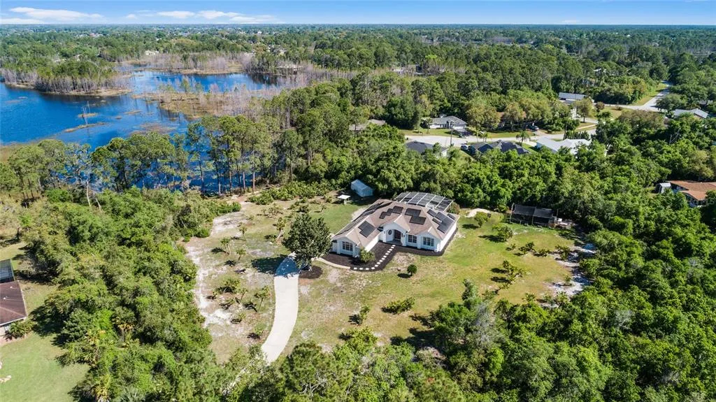 Under contract-accepting backup offers. *SELLER MOTIVATED! PRICE IMPROVEMENT! SOLAR PANELS, FURNITURE(optional), JOHNNY BOAT AND 1 YEAR HOME WARRANTY INCLUDED.* Escape to off-grid living in this stunning home nestled on a serene 2.53-acre parcel, offering the epitome of Lakeside Living. With a total of 2636 square feet of meticulously crafted interiors, this residence exudes comfort in every detail. Almost all furniture Included on the sale of the home, including Johnny boat. **INTERIOR:** Upon entry, be greeted by vaulted ceilings that infuse the space with an airy ambiance, while expansive sliding doors seamlessly invite you to the outdoor oasis. Discover unparalleled privacy and convenience with double master suites, ensuring a serene retreat for both residents and guests. The heart of this home resides in the beautifully remodeled kitchen, boasting modern appliances and generous counter space for culinary enthusiasts. The living room, featuring a sleek fireplace, sets the stage for cozy gatherings and memorable moments with loved ones. **UPDATES:** Experience the tranquility of sustainable living with new additions within the last 2 years, including a solar hot water heater, water softener, and solar panels. Recent exterior paint and interior upgrades such as new fans and lighting fixtures further enhance the appeal of this spacious retreat. **OUTDOOR:** Step outside to discover a Salt Water Screened Enclosed Heated Pool, providing a serene haven for relaxation and entertainment. Security is paramount, with a comprehensive ring system both indoors and outdoors, offering peace of mind for homeowners. Outdoor enthusiasts will delight in the amenities this property offers, including a floating dock with a boat. For gardening enthusiasts, a 20x40 greenhouse, numerous fruit trees, and King palm trees. Home includes a chicken coop with Chickens and bee autohive. Additionally, an in-ground trampoline promises endless hours of fun and laughter for all ages. Whether you crave a tranquil retreat or an entertainer's paradise, this home in Highland Lake Estates promises to surpass your expectations. Seize the opportunity to make this slice of paradise your own. Schedule your private tour today and experience the pinnacle of lakeside living! bring all reasonable offers.