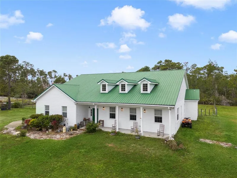 Gorgeous 4/2 Equestrian Estate located on 10+ acres in Rural Deltona Estates. The home is USDA Eligible. Bring your horses and enjoy country living minutes from the surrounding Volusia County cities. When you enter the property you immediately notice the open fields of green grass and forested back lot. The 3075 sqft barn is located toward the front of the property allowing for any boarders if the homeowner chooses to have any to have easy access and privacy for the homeowner. There are twelve 12 x12 stalls in the barn which has a concrete center isle. Includes a tack room and wash rack. Plenty of storage for feed. Most stalls have heavy mats for your horses. As you approach the custom built home you'll notice the RV pad perfect for guests or your own rig. The covered front porch is perfect for rocking in your rocking chair and enjoying the tranquility of the open fields. The home boasts big open living spaces and spacious bedrooms with crown molding and tile throughout the entire home. Enjoy the cold Florida winters around the large stone wood burning fireplace in the great room with high vaulted ceiling. The kitchen has butcher block and stone isle counter tops. Cooking is such a pleasure here. Above the range is a wall mounted pot filler faucet for easy boiling. French door open to the back porch which is perfect for sunsets and tranquility that the property offers. Make an appointment and come see this beautiful custom home on such a special property surrounded by large acre estates. The metal roof on the barn and house was retrofitted in 2023 with new fasteners, AC is 2024, Water Hater 2023, Septic was pumped December 2024 and new pump installed, Newly painted exterior which is hardy board over concrete block.