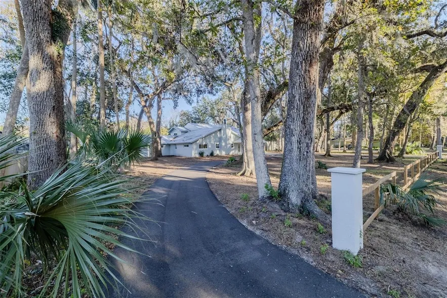 REDUCED! This exquisite 2-story estate home in New Smyrna Beach, Florida, offers 5 bedrooms, 3.5 baths, and 3,698 SF of meticulously renovated AC living space on a lush 1.18-acre lot. Located just east of I-95, it provides easy access to grocery stores, shopping plazas, restaurants, public golf courses, and is a mere 10 minutes from both the Intracoastal Waterway and stunning beaches. The property features a circular driveway winding through a serene canopy of oaks and palms, with a cleared backyard bordered by a drainage canal. The home boasts a versatile 3-car garage with epoxy floors and an additional side-load 4th car garage or workshop. Modern upgrades include new windows, a metal roof, plank tile floors, wainscoting, crown molding, and high-end fixtures. The first floor encompasses a living room with a wood-burning fireplace, dining room, family room with a half bath opening to a large covered porch, and a spacious kitchen with quartz counters, GE stainless steel appliances, and a dry bar with a wine cooler. The first floor is also host to the primary bedroom suite, complete with private bathroom, walk-in closet and a connected bonus room measuring 14.5 x 1 3 that would make a great office, study, gym, yoga or art studio. Upstairs, vaulted ceilings enhance a den, guest bath, and two large bedrooms, one with a walk-in closet, creating a perfect blend of elegance and comfort. This truly is a one-of-a-kind private property that lets you feel like your're 100 miles away, yet minutes to everything you love to do. Don't let this one get away, schedule a private showing and start living the life you've always dreamed of. ALL INFORMATION IS ASSUMED ACCURATE BUT NOT GUARANTEED. ALL MEASUREMENTS ARE APPROXIMATE. BUYERS AND THEIR AGENTS SHALL VERIFY ANY INFORMATION DEEMED IMPORTANT TO THEM.