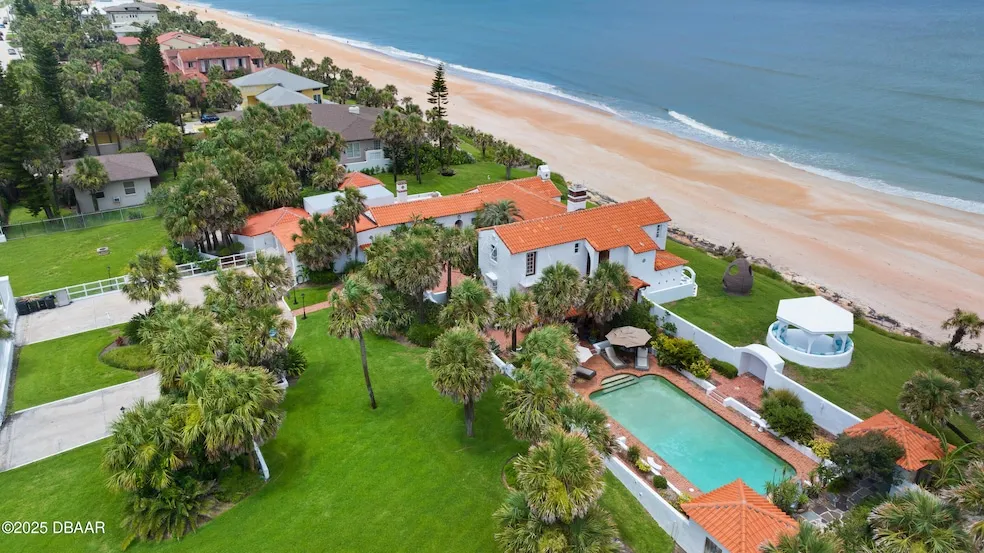 Welcome to one of Ormond's most enchanting historical icons, ''The Doldrums,'' affectionately known as ''The Spanish House''! This stunning Mediterranean villa has hosted legends like the Rockefellers and racing icons, and CEO's. Imagine entertaining friends in a home that whispers stories of the past while offering the modern comforts of today! Nestled on over an acre of pristine beachfront, with a remarkable 243 ft of water frontage, The Doldrums is your personal paradise. As you enter through the wrought iron gates, you'll be greeted by a charming courtyard and authentic Spanish tiles that exude character and warmth. With over 3600 sq ft of living space, this exquisite home features soaring high ceilings, exposed cypress beams, and gorgeous brick and tile flooring. Enjoy 5 spacious bedrooms, 3.5 baths, and tons of room for visitors. Picture yourself basking in the sun by the huge beachfront pool savoring the gentle ocean breeze and stunning views... Don't miss the expansive backyard with a large gazebo, perfect for morning coffee as you watch the breathtaking sunrises over the Atlantic Ocean. This home it's a private oasis on a no-drive beach, surrounded by multi-million dollar estates. Located right across from Oceanside Country Club and just minutes from upscale dining and shops. Whether you seek relaxation or a vibrant social life, this gem is waiting for you to make it your own.