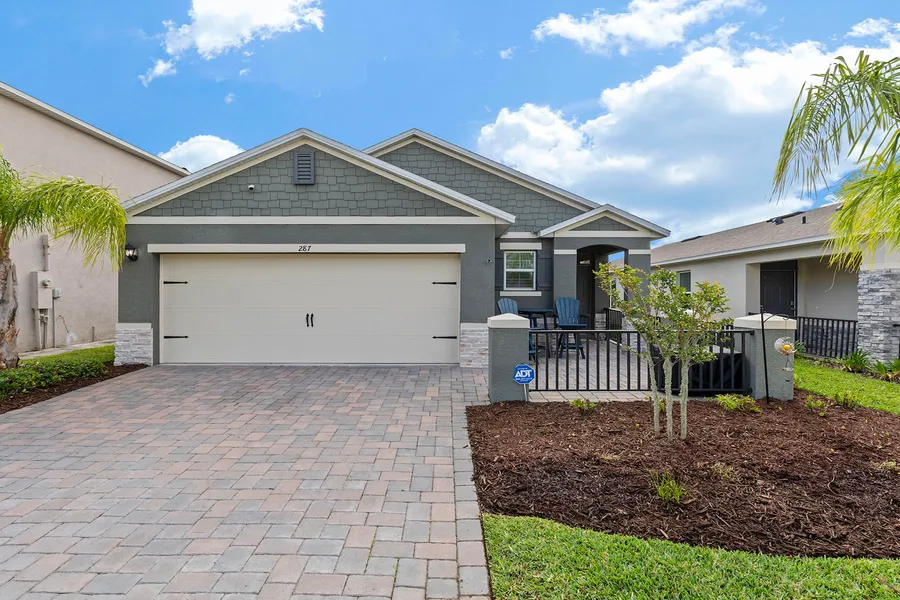 Nestled in The Palms of Venetian Bay, this stunning home built in 2022 was designed for effortless entertaining with the open-concept layout being both inviting and functional. A charming courtyard porch welcomes you, while the sealed paver driveway and meticulously maintained landscaping enhances the home's curb appeal. The kitchen is a chef's delight, featuring soft-close ivory shaker cabinets, gleaming granite countertops, and stainless steel appliances. Throughout the main living areas, elegant LVP wide plank flooring adds a touch of sophistication, while plush carpeting in the bedrooms ensures comfort. The home also offers an in-home laundry room, custom plantation shutters, an added garage door opener, and thoughtful upgrades throughout. Wake up to serene pond views from the primary suite, which boasts a spacious walk-in closet and an ensuite bath with dual vanities, a large linen closet, and a private water closet. A custom glass shower door and new shower head, installed in 2023, add a modern touch. The guest bathroom is equally impressive with granite countertops, a custom glass shower door, and an upgraded shower head. Step outside to your cathedral-style screened patio, complete with a built-in dog door, added in 2023. The aluminum fenced backyard, featuring two gates, offers breathtaking lake views and a perfect space for relaxation. Venetian Bay is more than just a neighborhood—it's a lifestyle. Enjoy shopping and dining at the Town Center, tee off on the championship 18-hole golf course, or indulge in a day of pampering at the local spa and beauty salon. Outdoor enthusiasts will love the community's parks, scenic walking and biking trails, and the well-maintained tennis and pickleball courts. Conveniently located near the clubhouse and just nine miles from the beach, this home offers the best of both comfort and convenience. Ample green space offers room for a private pool.