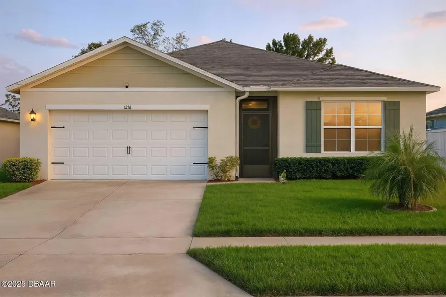 Welcome to 1216 August Sky Drive: a beautifully move-in ready 4-bedroom, 2-bath ranch that blends comfort, convenience, and smart living. Ideally located near Pell's Nursery and Feelgood Winery, the property also connects to the Coast-to-Coast Trail with access to Gemini Springs-perfect for outdoor enthusiasts. Interior features include tile flooring throughout (NO carpet), a safe in the master closet, upgraded glass doors on the master bathtub, added garage insulation, and a full smart home setup. The ADT security system ready for activation. Cameras at the front door, garage, and rear lanai. MyQ smart garage system include. All appliances convey, including a range with built-in air fryer. Furniture includes living room, office, lanai, and entry table. Brita whole-house water filtration system with 3 years of supplies/ transferable warranty, full perimeter irrigation system, Lennox A/C, screened front door and back lanai. Schedule showing!