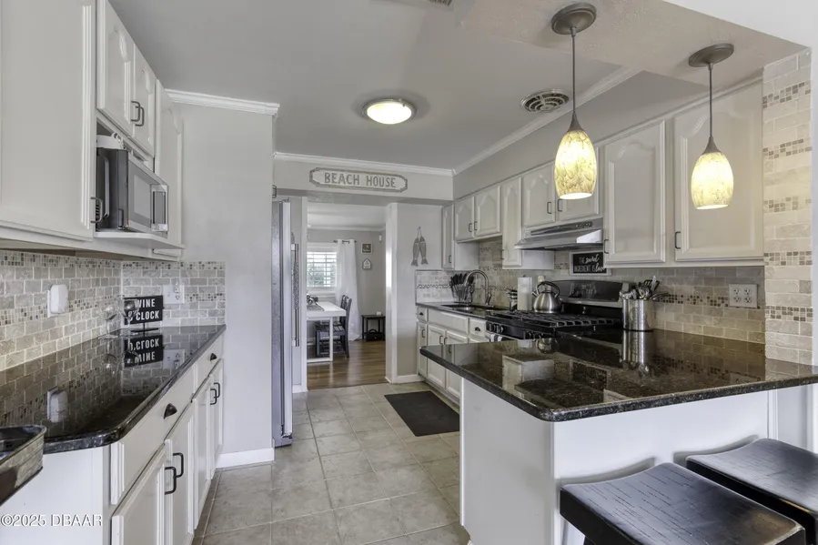 Enjoy peace of mind with a BRAND NEW ROOF.. welcome to your perfect getaway - a charming 2-bedroom, 2-bath beachside beauty in the sought after beachside community of Ormond-by-the-Sea. This Turn-key coastal retreat, offered FURNISHED, and located just steps from the beautiful beach or river! You'll find elevated coastal vibes through out. This beautifully remodeled home has new bathrooms and a kitchen with granite counters, a gas-stove, and upgraded stainless steel appliances. The flexible back-room, currently set up as a dining area, this flex space gives additional room for comfortable entertaining. A 1 car garage also provides additional space for vehicles, beach toys and storage. the property includes a washer and dryer for your convenience.