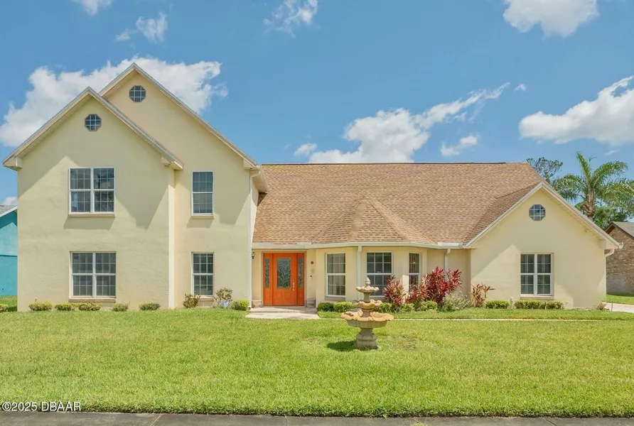Step into this beautifully designed home in a beautifully manicured neighborhood with 3 bedrooms, 3 bathrooms, 2,157 square feet of comfortable living space in one of Daytona Beach's most desirable communities. Natural light fills the home, highlighting the soaring cathedral ceilings and open-concept layout that flows seamlessly throughout. The expansive living room and family room provide the perfect place to unwind, while bonus room that has own entrance, offers options. Has formal dining room and a generous breakfast nook area. The luxurious downstairs primary suite is a true retreat, complete with a cozy fireplace, and not one but three walk-in closets. Upstairs, two additional bedrooms also feature brand-new carpet-one with a spacious built-in closet with crystal chandelier, the other with convenient hidden attic storage. Perfectly situated moments from Daytona One, Bridge to Beach, and the iconic Daytona International Speedway with unlimited restaurants nearby.