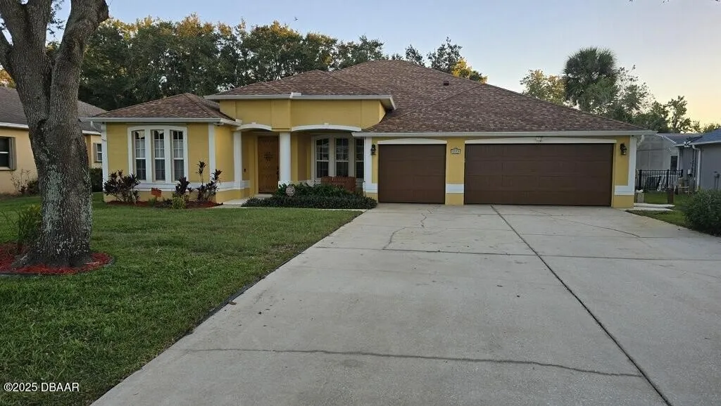 Impeccably maintained Sunrise Oaks residence combines timeless design with modern upgrades and a serene preserve setting. This 3-bedroom (plus a bonus room), 2-bath, 3-car-garage home with 9' ceilings offers nearly 2,600 sq ft of open living space enhanced by a new 2022 roof, hurricane-rated insulated garage doors, and custom storm shutters. The office and bedrooms feature tongue-and-groove hardwood flooring and porcelain tile. The gourmet kitchen includes a large, walk-in pantry and over 30 feet of counter space, while the screened lanai overlooks a fenced, private backyard with tranquil water and nature views. New epoxy-finished garage flooring adds a polished touch. A monitored security system gives peace of mind. Located minutes from shopping, restaurants, and City Center, and just a few miles from the beach, Reed Canal Park, and Daytona International Speedway, this family-friendly n...