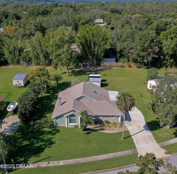 This beautifully maintained home on .5 ACRES features 3-bedrooms, 2-bathrooms just off of Central Park Blvd. Spacious layout, thoughtful updates, and a huge private backyard oasis - all with no HOA restrictions and NO flooding. Recent improvements include a 2023 roof, and impact-resistant windows and patio doors. Adorning the front landscape you'll find a curated butterfly garden, attracting butterflies galore. Step inside to find a welcoming tiled foyer filled with natural light. Soaring vaulted ceilings and a tile-accented wood-burning fireplace anchor the expansive living area, while neutral tones create a relaxing backdrop throughout. The kitchen is both practical and inviting, featuring white cabinetry, generous counter space, a full appliance package, and a pass-through window that connects seamlessly to the living area... Continued... Just off the kitchen, the dining area enjoys peaceful backyard views through sliding glass doors that lead to a screened patio perfect for spotting the hummingbirds and butterflies. The spacious primary suite feels like a private retreat, with a tray ceiling, large window overlooking the backyard, and direct access to a beautifully renovated en-suite bath. The bathroom showcases granite countertops, a double sink vanity, updated cabinetry, and a tiled walk-in shower with mosaic accents and built-in shelving. Two additional bedrooms offer flexibility for guests, family, or a dedicated home office. Step outside to the screened patio that leads to an expansive backyard with lush lawn and a detached storage shed - ideal for tools, hobbies, or recreational gear. Attached covered garden shed and workshop for additional space. A two-car garage and extended driveway provide ample parking, while the freshly painted exterior and sealed stucco deliver lasting curb appeal. Situated in a quiet, established neighborhood with no HOA, there's added flexibility for boats, RVs, or other outdoor needs. Located minutes from the beach, shopping, dining, and the famous Neighbors Ice cream shop, this move-in-ready home offers comfort, flexibility, and a prime Port Orange location. All information recorded in the MLS is intended to be accurate but cannot be guaranteed.
