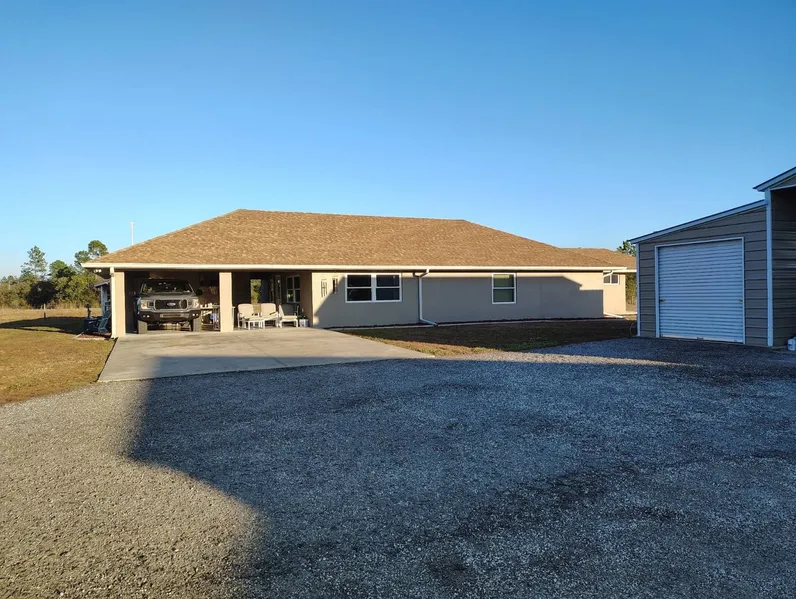 This is a ranch style home located west of I-95 in the rural equestrian area of SE Volusia County. There are front and rear driveway entrances to the property, both with solar gates, and 4' field fence all the way around the property. The home is contractor/owner built with 1735 square feet, 3 beds, 2 baths, including 600sf master suite with separate vanities, shower, and tub and a huge closet. The master suite is designed to be locked off from the main house if you are seasonal and have part time guests or want to Airbnb. If you have need of a work or hobby shop, or just a LOT of toy storage this home is for you. There are 3 outbuildings; 1) 35' x 42' with 2 garages and an RV/boat drive thru space with 30 amp hook up. 2) A 24' x 30' shop or toy storage building with a 3-sided lean to 12' x 30'. And 3) an undercover grill area with sink and 10' x 14' storage. There is a large open double carport that could easily be enclosed into a garage. There is an outdoor utility room adjacent to the carport for washer, dryer, freezer, fridge, water heater, and water softener system. The home is of masonry construction with every block cell filled with concrete and rebar. There is 5/8" CDX plywood roof sheeting, NO OSB board. The great room has a 3/4 swirl plaster ceiling, and the entire home has plastered walls and ceilings. No knock-down or orange peel here. Master bedroom including closet and bath ~ 600 sf / Second bedroom with closet ~ 278 sf / Third bedroom/office with closet ~ 126 sf. There are PGT vinyl double hung Thermopane insulated windows. There is a new 3-ton Tempstar AC/heat system in 2021 with 10 year warranty. The real cherry all wood cabinetry has full extension soft close drawers, soft close doors, and there are solid surface counters throughout. I have a recent survey and appraisal.