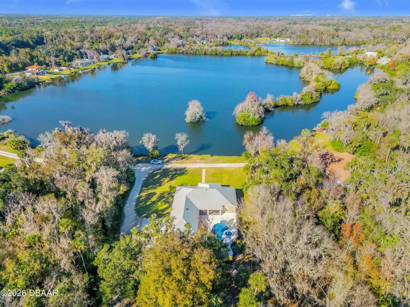 174 feet of pristine waterfront 4 Bd, 2 Ba, 2 Car Garage pool home nestled on 5 acres in a private tucked away community abounding with natural beauty free from ITOA restrictions is minutes to New Smyrna Beach and local attractions. The stocked lakefront home has easy access to beaches, boating, boat ramps, marinas, shopping and dining on historic Canal Street and Flagler Ave. It features an open floor plan kitchen, dining, living area that all open up to front and back covered porches. Inside are wood cabinets, stone countertops, island, wine fridge, and upgraded appliances. Primary en-suite has a walk-in shower and soaking tub. Outside is an enclosed designer pool with spa. This home has two multi use rooms with the ability to be used as a ADU- Accessory Dwelling Unit (i. e. Granny flat, Casitas, or in-law suite). If you are wanting to ''live off grid'' but feel like you are living in luxury, then this home should be high on your list to view and buy. Very close to New Smyrna Beach and Canaveral National Seashore. There is private access to paved walking and biking trails. The bonus is the extra detached 1 car garage and workshop.