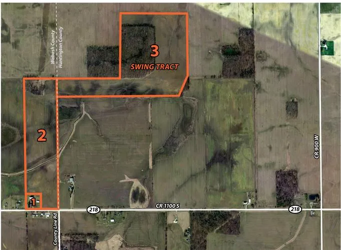 Tract 1: 7906 E. St Road 218, Wabash. 2.6+/- Acres with Farmstead & Buildings. Home, 1,100 sq ft, 1-story, vinyl siding, central air, 2 bedrooms, 1 bath. Buildings include a 40 x 60 barn and a 28 x 50 outbuilding.