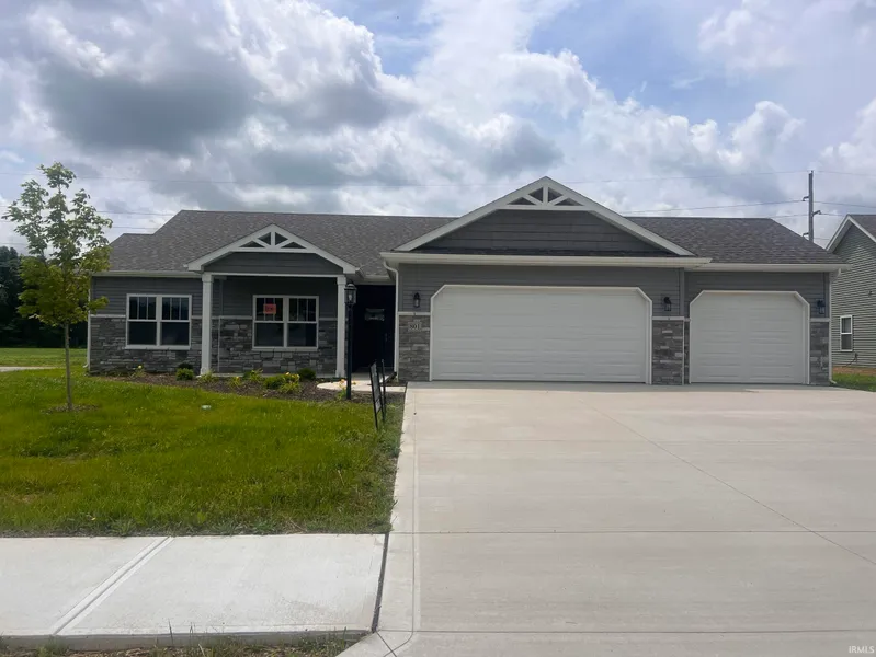 Beautifully Built Ranch Home with 9' Ceilings Throughout Upgraded Front Door with a Sidelite Custom Hickory Cabinets in Kitchen, Laundry and Baths Premium Stainless Steel Dishwasher and Microhood Upgraded Premium Countertop with Elkay Quartz Double Bowl Drop-in Kitchen Sink along with an Upgraded Spot Resist Stainless Pulldown Kitchen Faucet Rounded Drywall Corners. Upgraded Interior Light Package and Interior Door Hardware throughout the Home Great Room has a Lighted Ceiling Fan with Speed Control Switch Locking Vinyl Plank Flooring in Kitchen, Dining, Great Room and Both Baths Primary Bedroom with Lighted Ceiling Fan and Walk-in Closet Primary Bath has 5' Walk-In Shower with a Rain Shower Head 36" Tall Vanity, Cultured Marble Vanity Top, Upgraded Bath Fixtures & Elongated Toilets in Both Baths Full View Glass Rear Patio Door leading to Rear Covered Patio 95% Efficient Gas Furnace and Central Air Conditioning with Fresh Air Ventilation and Programmable Thermostat Semi-Finished 2 Car Garage with a Dedicated Electrical Outlet, Garage Door Opener and Wireless Keypad Semi-Finished 3rd Bay with Opener Beautiful Exterior with Address Stone, Upgraded Exterior Lighting, Landmark Shingles along with Partial Stone Front and Vinyl Siding & Shakes. Also, Andersen Windows Grilles located on the Front Elevation Windows