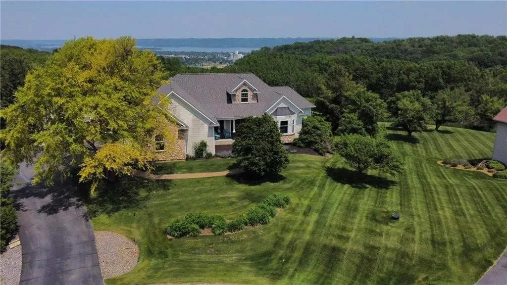 Gorgeous lakeview property! Enjoy this country setting with all the amenities! Beautifully maintained and updated property with over 2 acres, in-ground lawn sprinkler, in an established community, and in a cul de sac! Beautiful open concept with gourmet kitchen that opens up into dining area and sunroom with fireplace! Sunroom walks out to maintenance free grilling deck that overlooks Lake Pepin and backyard patio! Hardwood floors throughout as well as in-floor heat and multiple fireplaces. Private master suite with walk in closet, wood accent wall, walk in tiled shower and jetted tub. 2nd bedroom located on the main floor as well as a living/piano room with wood fireplace and gorgeous views of the lake! Fully finished basement with in-floor heat, fireplace and surround sound for all of your movie or sports nights! Spacious family room, wet bar, exercise room, full bath, 2 bedrooms and full bath! Walk out into the enclosed screen porch with teak wood flooring - perfect for coming in from the hot tub and flagstone patio area! Enjoy the 1,000 sq ft patio with built-in gas firepit! Extend your enjoyment of this beautiful property in the full detached man cave!! Man cave is fully equipped with golf simulator, dry bar with indoor-outdoor bar, maintenance free deck overlooking the lake, gaming center with multiple options, linear gas fireplace and surround sound! Upstairs loft area has multiple uses! Heated workshop tucked in the garage under the mancave! Separate heating and cooling systems then home! Beautiful property to entertain in, or just enjoy all to yourself! Don't miss out on viewing this beautiful property!