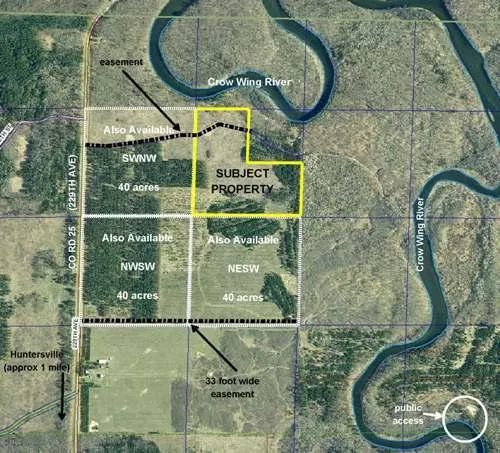 30 acres just over a mile north of Huntersville and only a quarter of a mile off paved Co Rd 25 (229th Ave). Crow Wing River public access to the southeast. Nearly all level upland with large open areas of young Aspen and Red Pine combined with clusters of 29-51+ year old Red Pine. Within Huntersville State Forest boundaries. Excellent big game and grouse hunting area. An easement through the northwest portion of the tract provides access to this tract and adjoining land. Additional land also available (MLS# 201838, 201842, 201844).