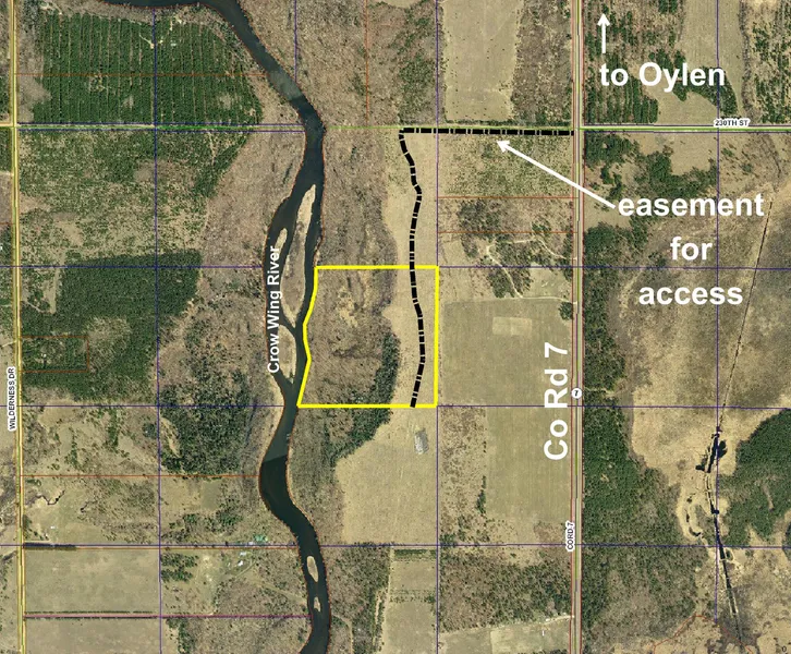 Wooded 36.75 acres just a mile south of Oylen (north of Staples) and half a mile off paved Co Rd 7. Steeply sloping land with young Red Pine and Swamp Hardwood. Wetland area in the northcentral part of the tract. Approx 1333 feet of frontage on Crow Wing River. Within Lyons State Forest. Hundreds of acres of public land across Co Rd 7. Sand (Lily) Lake only about a mile south. An easement through property to the north and northeast provides access to this and adjoining tracts to the south.