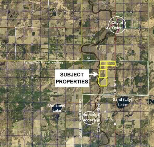Wooded 39 acres just a mile south of Oylen (north Staples) and a mile off paved Co Rd 7. Level land steeply slopes towards the river. Young Red Pine cover most of the tract with Swamp Hardwood lining the river. Approx 1430 feet of frontage on Crow Wing River. Within Lyons State Forest. Hundreds of acres of public land across Co Rd 7. Sand (Lily) Lake only about a mile south. An easement trail through property to the north and northeast provides access to the property. Additional land also available (MLS# 202434 & 202437).