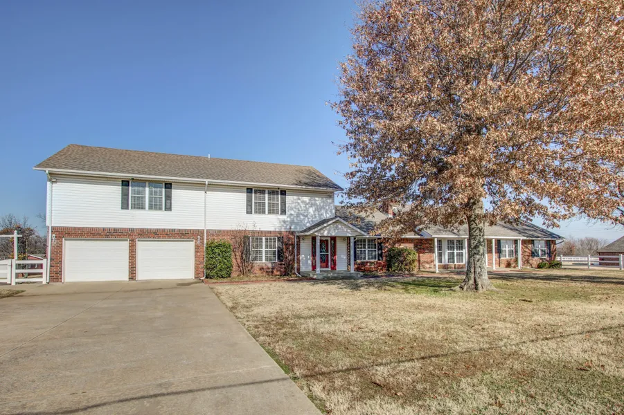 Lovely property on approx. 2 1/2 acres with pond with dock and gazebo. In-ground salt water pool, hot tub, storm shelter, 50 x 60 shop with extra tall garage door, 2nd bldg w/garage & office & half bath. 3rd bldg for lawn equipment. Kitchen newly opened to family room or dining, Master and bedroom 2 & game room downstairs. 3 large bedrooms & open area/office upstairs. Covered balcony looks out to a fabulous view of the property. Whole house water softener, roof - 3 years.