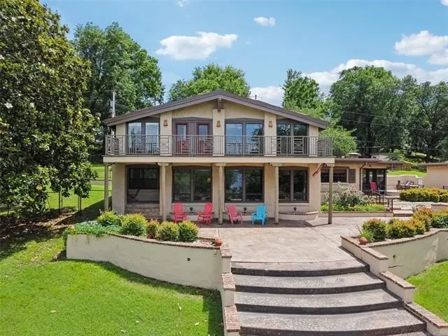 Nestled on over 2 acres of serene, wooded land along the shores of Fort Gibson Lake, this home known as: The Villa at Sportsman Club, offers a rare opportunity to own a piece of Oklahoma's natural beauty. Once part of a historic ranch, this property has been transformed into a private haven, perfect for those seeking tranquility, wildlife observation, and a close-knit community. Enjoy direct access to the lake with a dock featuring a boat slip and hydro-lift. The expansive patio spaces including an enclosed patio plus a balcony provide stunning views of the water, making it an entertainer's dream or a peaceful retreat. This 3-bedroom, 2-bathroom home has been thoughtfully updated to blend modern comforts with rustic charm. Recent renovations include new paint, carpeting, and renovated bedrooms. The vaulted living room boasts a 20+ foot ceiling with exposed beams, a massive wood-burning f...
