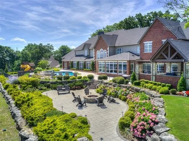 Luxury and relaxation come together in this lakefront retreat overlooking Fort Gibson Lake! Outdoor living includes a fire pit, outdoor kitchen, heated/chilled saltwater pool with spa, waterfall, and playground. Designed for entertaining, this home features panoramic views, a two-story great room with massive windows, and a sunroom. The updated kitchen opens to both formal and casual dining areas, and four of the five spacious bedrooms include living areas (all have private baths). One suite features a home office, and the first floor suite has its own kitchenette. There’s something for everyone, including a home gym with a spa area (steam showers, sauna, massage room, tanning room), a theater room with a wet bar, multiple game rooms, and a wine cellar with a tasting area. The home also offers two separate garages for 8-car storage, with an extended 10 x 20 opening with hoist lift. Every detail of this property has been thoughtfully designed and maintained for peace of mind, with stunning custom finishes throughout—including granite, tile and millwork. Pictures just don't do this home justice; must see in person to appreciate everything it has to offer!