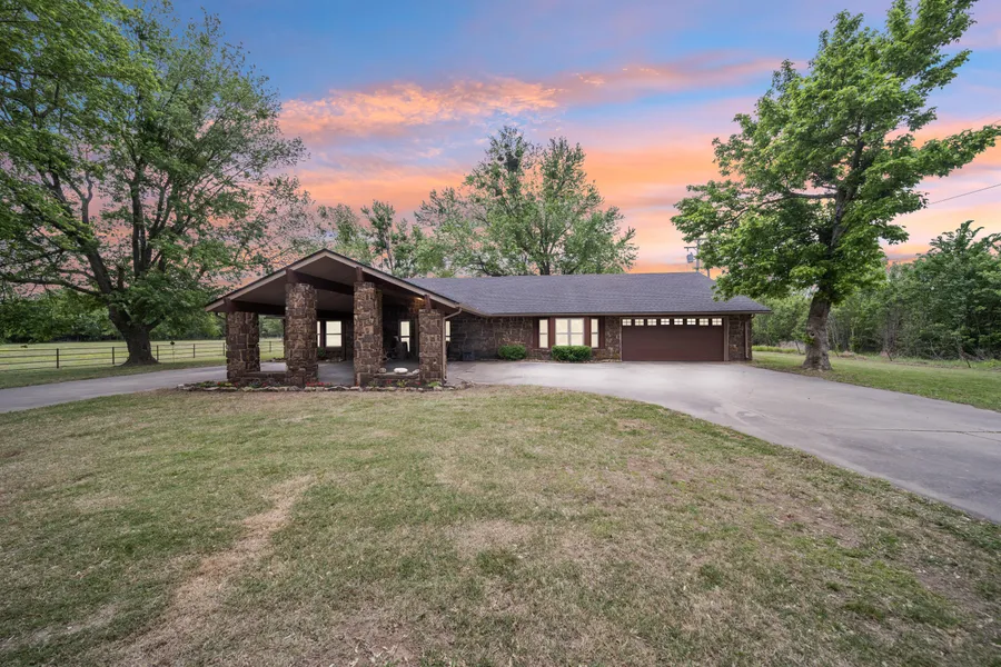 Welcome to your dream ranch-style estate nestled on 5 picturesque acres of Oklahoma's lush countryside. This charming residence boasts a seamless blend of modern amenities and rustic elegance, offering a tranquil retreat for you and your family. Step inside this 4-bedroom, 3-bathroom sanctuary and be greeted by the airy open-concept living space adorned with vaulted ceilings and halo can lights, creating a warm and inviting atmosphere. Meticulously updated within the past 5 years, this home exudes timeless appeal and contemporary comfort at every turn. Entertain effortlessly in the spacious living/ dining/ kitchen combo, featuring beautiful hardwood floors, luxurious travertine tiles, and gleaming granite countertops accented by soft-close hinges. Unwind in the oversized master suite, complete with a lavish en-suite bathroom boasting a soaker tub and walk-in shower. Three additional gene...