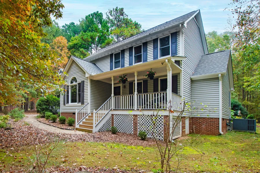 Tucked away "Country Convenience" minutes from Harris Crossing off Capital Blvd just north of NC-98. Such a quiet and restful feeling on 1.48 acres with gardening areas. Open family room/kitchen and combination kitchen/dining/eating area with breakfast counter seating a minimum of 4. Cathedral and vaulted ceilings on the first floor with smooth ceilings throughout the house. Higher ceilings and nice shelving in the oversized garage. Balcony overlooks rear family room with main house staircase up the rear. Updated kitchen with quartz countertops. Spacious primary bath renovation. Deep, heavily-wooded lot front and rear of home might remind some of a wildlife preserve. County Taxes, State-maintained Road. Home has been well-maintained.