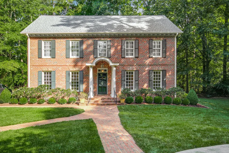 A lovely home entered by a circular driveway is a private oasis on a quiet cul-de-sac in one of Raleigh's most prestigious neighborhoods, Sheffield Manor. A stately traditional home with 4 bedrooms, 4.5 baths and multiple living spaces. This home has a wooded back yard that backs up to Honeycutt Greenway and trail and to the Corps of Engineers Land, so total privacy! A three-story floor plan with two family rooms, bonus rooms, office space and a first-floor guest room and bath. Nine-foot ceilings on the first floor, beautiful hardwoods, Plantation shutters, crown molding and transoms make this a house you love coming home to. There is flexibility in this floor plan for any buyer. Tasteful detail is easily seen in this classic design, while seamless access to I-540 truly makes this location the quintessential mix of retreat and accessibility.
