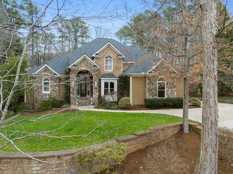 Located in the heart of North Raleigh, with no city taxes, on over 2 landscaped acres and at the rear of a private cul-de-sac is this gorgeous custom built basement home. This property impresses from the outside to the inside. Beautiful lush landscaping and natural surroundings greet you as you approach the home and enter the long driveway with circular turnaround and side-entry 3-car garage. The courtyard features a fountain, an expansive stone patio and a wraparound porch measuring over 65’ in length with ceiling fans, recessed lighting and outdoor audio installed in the bead board ceiling. Inside you’ll find an interior that has been recently refreshed with new paint, updated lighting and new carpeting. The main level features a bright, modern kitchen with quartz counter tops, stainless appliances, center island, white cabinetry with under cabinet lighting, subway tile, walk-in pantry and a sitting area featuring a gas fireplace. Enjoy entertaining in the expansive rec room with vaulted ceilings, stacked stone fireplace and skylights. Central to the main level is the dining room and a family room featuring soaring two-story ceilings. 1st floor primary bedroom, ensuite bath with vaulted ceiling and a walk-in closet. The spacious basement features a bedroom, full bath, plumbed bar with beer taps, gas fireplace and multiple flex rooms to use as you please - fitness room, home offices, game/media room etc. The second level features three bedrooms and two full baths. Other features include: new dual tankless hot water tanks in 2023, roof new in 2021, irrigation and security systems, water softener, plantation shutters, whole house audio and almost 800 sq ft of walk-in storage.