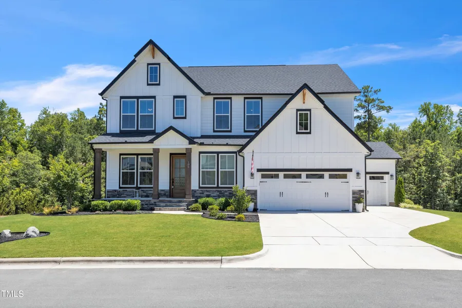 Gorgeous North facing Farmhouse style Vanderburgh floorpan with AWESOME tweaks and upgrades! Look at this yard! Carefully curated grass and landscaping with above ground sprinklers with timers. Black aluminum fence with gates on each side. Custom landscape lighting and uplighting. Once you walk into the home from the covered porch, you walk into 10 foot ceilings with 8 foot doors on the maint level and 9 foot ceilings on second. LVP flooring and upgraded tile only in home! Walk into the house and see the beautiful view of private lot with view of water retention pond and trees! Sellers had 12 foot Western slider door put into home that opens to deck, want the shade down? Use the remote and your shades come down, we also have in the Primary bedroom. Seller upgraded the appliances to Kitchen Aid (they left the hood draft Whirlpool for aesthetic reasons, it does blow outside)Kitchen Aid stainless steel dishwasher, wall oven and convection microwave. The gas range has 8 burners. Quartz countertops and Island! Also has beautiful natural stone backsplash in a diamond pattern. Eat in Kitchen with screened porch access. This overlooks lush backyard grass is fenced in and view is great! Family room with timber beams, gas log fireplace and nook with timber shelving. First floor bedroom with a FULL bath right outside of the door for guests to use or for bedroom. Drop zone and ''butler like pantry'' area when you walk in from the garage! As you walk up the LVP stairs you walk up into the large bonus area loft! The laundry with with sink and cabinets is also on the second floor. 3 full baths on second floor. Two bedrooms and the bonus to share the full bath in the hallway. One bedroom with private bathroom. Then HUGE Primary bedroom with DUAL walk in closets that are very nice sizes. Private water closet and large walk in shower. All of the bathrooms except one have linen closet in bath! Blinds in home. New ceilings fans thru out with remotes. All rooms have cable pass through behind walls for cable, TV mount in family room above fireplace does not convey, goes with TV. Wall to be restored. Gas line plumbed for grilling on deck that was added in 2023 with permit. Not only is there a 3 car garage, BUT also extend workshop area WITH the three car garage. Garage is finished with epoxy flooring, painted and with many extra strategically placed outlets for the person who likes to do projects, work in garage. Along with upgraded LED lighting inside and camera's to watch over your vehicles, tools and equipment!Please note the only rack/shelving that conveys is one above workshop cabinets. All other hooks, tool holders or antique shelf in garage will be removed and walls returned to match surrounding walls. The workshop cabinets are not staying nor is the shop vac. Please note when looking at the drone shots to be left of the property with a circular access drive on parcel is pond access plant. The landscaping was recently planted and is owned by the City of Holly Springs. This is not going to be built on we have been told, It is an easement to access the pond for Pond Management . Which is one of the reasons the seller bought the property and loved how they would never have anything built next to them. Beautiful private back view and only one neighbor on right. Profressional floorpan/Measurement should be in 7/9. I am using the TAX square footage until my measurements come back from company.
