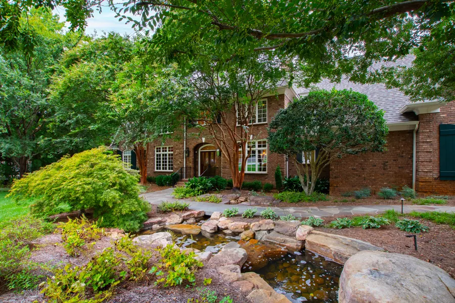 Nestled in mature trees and verdant landscaping in one of Cary’s most prestigious
