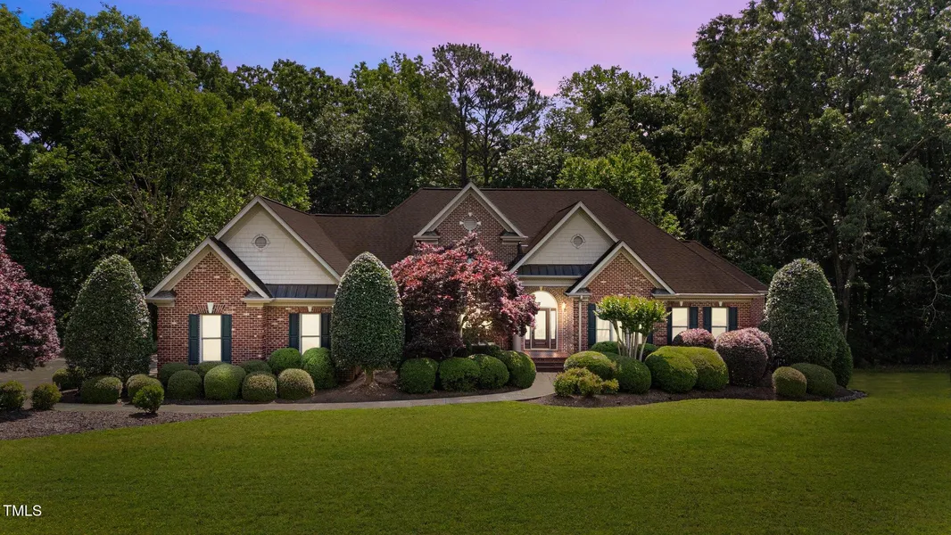 Welcome to 12504 Bayleaf Church Road! Located in the desirable Carlyle at Falls Lake community, this 3-sided brick estate home offers main-level living with a full walk-out basement, all nestled on a beautifully landscaped and private 1.85-acre wooded homesite—just minutes from Falls Lake. Step into the grand foyer with natural maple hardwoods, 12'+ trey ceiling, crown molding, and rope lighting. The formal dining room impresses with 17'+ ceilings, a stunning Palladian window, and detailed reed-and-ribbon chair rail and wainscoting. The gourmet kitchen is a chef's dream, featuring a Viking 6-burner gas cooktop with grill, 24'' gas convection oven, 13'' gas oven, Viking hood with warming shelf, custom Enkeboll overlays, SubZero built-in refrigerator/freezer with matching cabinet panels, Bosch dishwasher with matching panel, and a spacious walk-in pantry. The family room is equally grand, boasting a 19' vaulted ceiling, two-story window wall, and gas log fireplace. The primary suite is a true retreat with crown molding, recessed lighting, trey ceiling, ceiling fan, and double doors leading to the atrium. You'll also love the enormous walk-in closet with custom wood shelving and the luxurious primary bath with custom cabinetry, trey ceiling, crown molding, and a tilt-out laundry hamper. The finished walk-out basement offers incredible versatility with a second family room, wet bar, office, and a craft or exercise room—all overlooking the private backyard through the 2-story atrium windows. Enjoy outdoor living with a screened porch and stamped concrete patio perfect for grilling. Additional features include a 3-car garage, central vacuum system, and intercom. Neighborhood amenities include a clubhouse, swimming pool, and tennis courts—offering resort-style living close to nature.