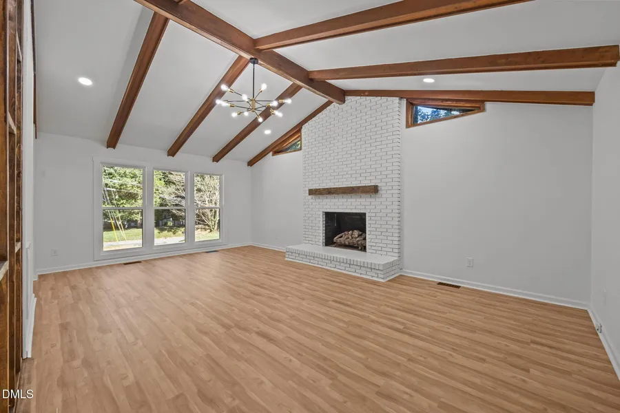 Step into a home that redefines modern living. This renovated, exceptional property blends contemporary design with timeless character, offering an impressive ''wow factor'' from the moment you walk in. The expansive open floor plan features soaring ceilings, exposed beams, a custom accent wall, recessed lighting, and a striking floor-to-ceiling brick fireplace that anchors the living space. Natural light floods through oversized new windows, highlighting the designer kitchen-complete with quartz countertops, a waterfall island, stainless steel appliances, and full-tile backsplash. The primary suite offers a true retreat experience, featuring private access to a spacious deck and gazebo-perfect for morning coffee or relaxing evenings outdoors. The ensuite bath exudes spa-like luxury with a dual vanity, custom tiled shower, and elegant designer finishes. Additional highlights include generously sized secondary bedrooms, a beautifully updated full bath with floating vanity and tiled tub, a large climate-controlled sunroom, and a separate laundry room. Outside, the flat, private backyard provides an ideal setting for entertaining, quiet mornings, or simply enjoying the outdoors. This home has been thoughtfully reimagined with modern comfort and style in mind. Schedule your private showing today and experience it for yourself!