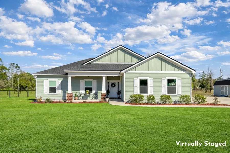 One or more photo(s) has been virtually staged. 10 Stone Way, Crawfordville - Like-new 4BR/2BA single-story home on 2+ acres with ~$30,000 in added upgrades, including a hot tub, expanded driveway, fencing, storage shed, and electrical enhancements. Built in 2022 by Golden Construction in the Preserve at Wakulla Station, the home features an open floor plan with wood plank tile floors, tray ceilings, a large kitchen with quartz counters, stainless steel appliances, and walk-in pantry. The primary suite offers a tray ceiling, walk-in closet, and luxurious bath with double sinks and walk-in shower. Mudroom, laundry, and covered back porch with hot tub complete the home. Hardie siding and detailed trim blend modern finishes with country charm. Convenient to Crawfordville, Tallahassee, Wakulla Springs, and area beaches. Measurements and lot lines approximate; buyer to verify.