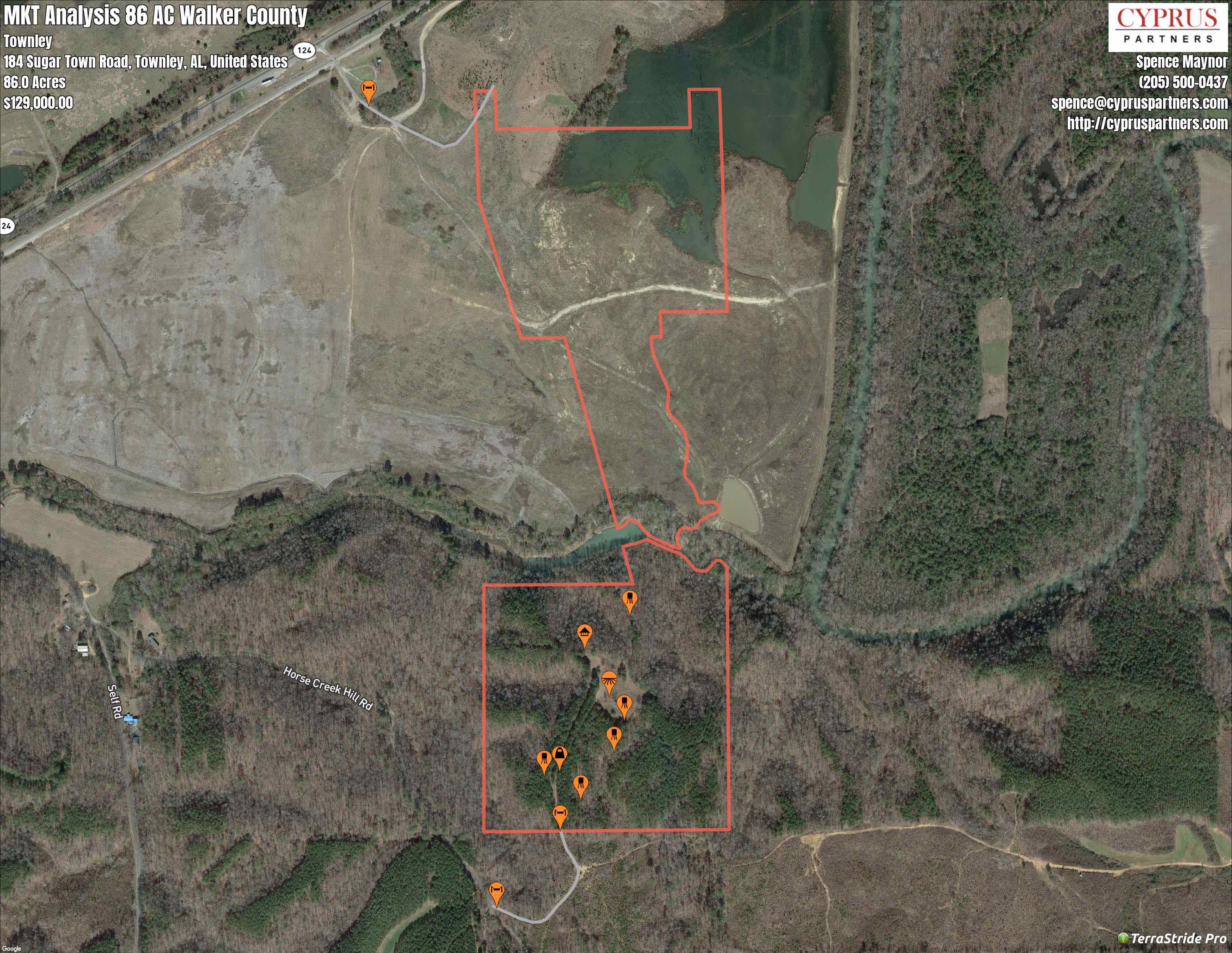 Research Parcel InformationDirections from I-22 to the property located at 184 Sugar Town Road, Townley, AL 35587: 1) HeadwestonAL-69 south toward Rufus Tubbs Rd for 0.9 mi. 2) Continue straight onto AL-124 W for 3.9 mi. 3) Turn left onto Sugar Town Rd. 4) Continue straight across the train tracks to the gate. 5) South forty access at 561 Horse Creek Hill Road, Oakman, AL 35579
