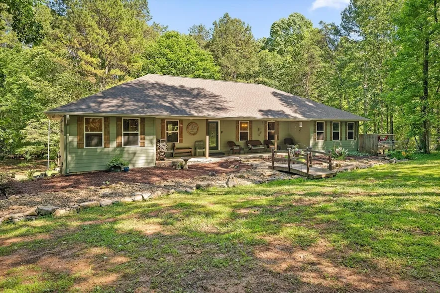 Escape to the privacy and serenity of 204 Chapman, a rare 6.97-acre creekside sanctuary offering over 650 feet of tranquil water frontage and a lifestyle of comfort, flexibility, and refined rustic charm. Thoughtfully designed with both everyday living and entertaining in mind, this home welcomes you with a cozy wood-burning fireplace and a main-level primary suite that opens to a private deck perfect for unwinding in nature. The suite's luxurious bath features an oversized soaking tub, a two-person walk-in shower with dual shower heads (including both rain and handheld options), and ample space for total relaxation. The heart of the home is an open dining space with a built-in dry bar, perfect for entertaining guests, while the well-equipped kitchen features a wall oven and microwave, and a built-in wine cabinet for connoisseurs. The functional laundry room is outfitted with built-in cabinetry and raised platforms for the washer and dryer, allowing for easy access and convenient basket storage underneath. Downstairs, the handicap accessible finished basement offers a complete second living space with its own full kitchen, making it ideal for guest quarters, multigenerational living, or potential rental income. A fourth bedroom and a dedicated media room complete the lower level. The two-car attached garage provides everyday convenience, while the detached outdoor studio is a dream man cave doubling as a third garage space and including a covered carport or tool shed. Just beyond, a peaceful greenhouse offers a private gardening sanctuary tucked away near the tool shed. The fenced-in backyard is ideal for pets, while the secluded private back porch invites you to relax and take in the sounds of nature. With thoughtful features at every turn and space to stretch out, grow, and retreat, 204 Chapman is more than a home it's a lifestyle.