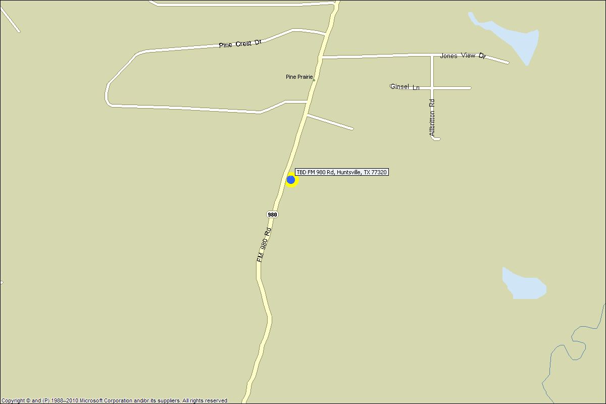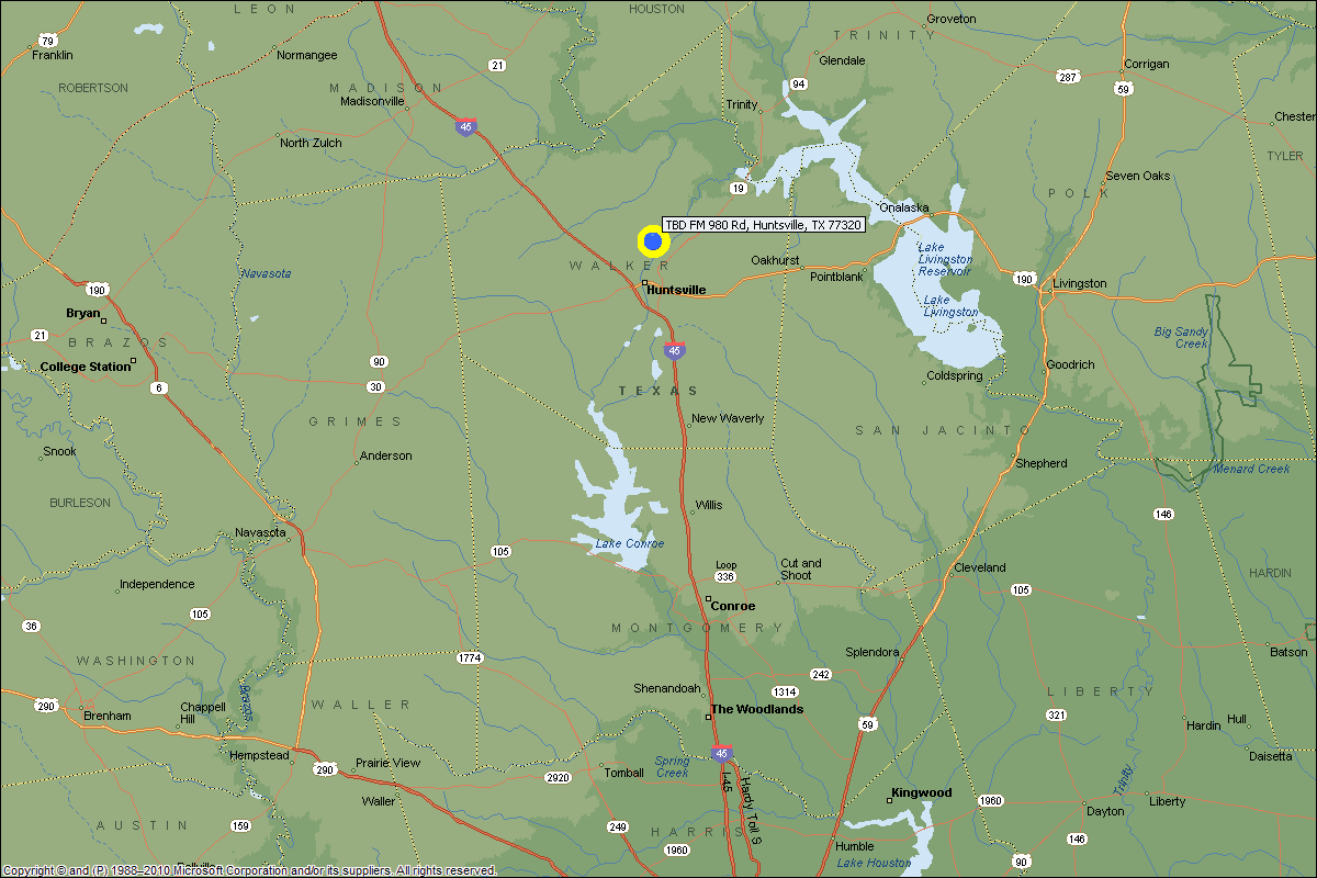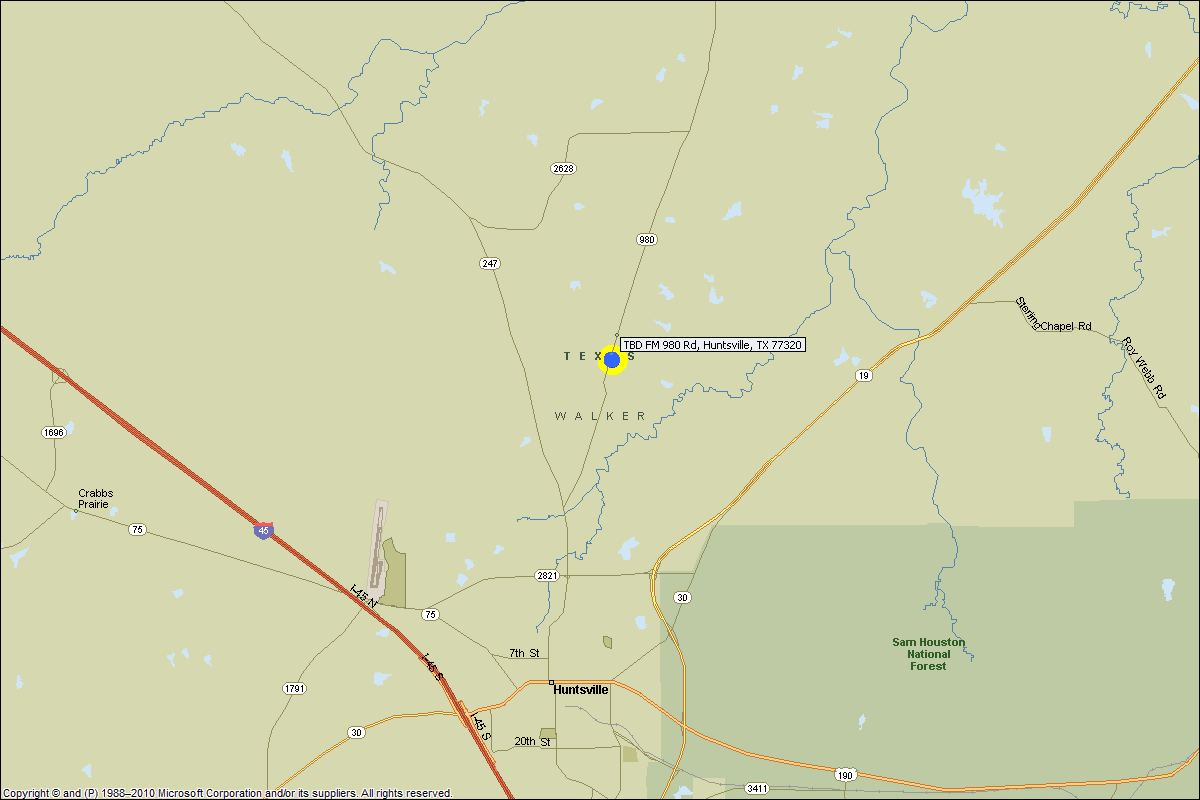 North of Huntsville, at the intersection of FM 2821 and FM 247, proceed North for approximately 8/10 of a mile. Turn right on FM 980 and follow for approximately 2.5 miles to property on the right.
