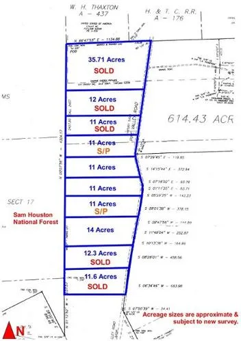 Beautiful east Texas timberland. About 10 miles from I-45. Quiet, peaceful surroundings, low traffic, one hour from downtown Houston, TX. Gently rolling, predominantly sandy loam soils. Hopkins Creek, young pine plantation and large timber along the creek. No floodplain. 14 +/- Acres each, adjoining Sam Houston National Forest.