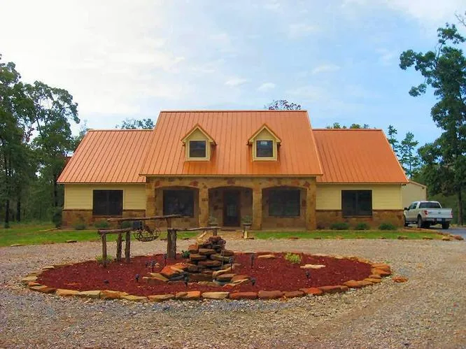 Fabulous, custom lodge-style home on 11.03 acres. Copper metal roof. Open concept floor plan, with 3 bedrooms/2 bathrooms downstairs, and 1 bedroom/1 bath upstairs. Gorgeous tile throughout, with cork flooring bedrooms. Custom cut stone work, and crown moulding, with knotty pine ceilings. Property improvements feature a 1500 sq foot metal barn on a slab, w/ 1090 sq. ft. apartment inside, 1 bed, 1 bath. This is a great find, for peace & quiet in the country.