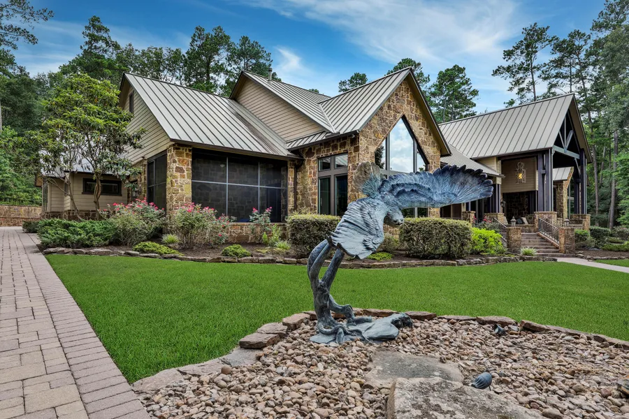 Come see this gorgeous lodge-like custom one-story home on 27 beautiful rolling acres in Walker County near New Waverly.Huge ceilings, beautiful wood beams & tons of custom millwork. The kitchen is complete w/Wolf appliances, 2 sinks, a huge pantry, & more. The primary suite is wheelchair ready, has huge his/her closets(one is concrete reinforced), an exercise/study area & a fireplace. Gorgeous views of the almost 3-acre trophy-stocked pond(Bass, Stripers, Bluegill)from the Primary Suite, guest suite, office, dining room, & elaborate front porch. Large pool & spa to keep you cool during the hot summer months.Oversized 3 car garage, & giant game room & bathroom above.Huge heated barn w/bathroom for the workshop & all of your toys.Additional covered parking for an RV at the secondary barn, where the previous owner kept their horses, w/office, tack room & bathroom. Fenced & cross-fenced.The...
