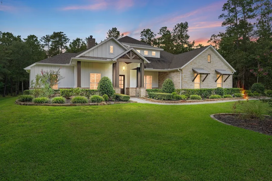 Rvision Model Home backed to the National Forest located in the highly desirable acreage community in Texas Grand Ranch! You enter this stunning one story through double wood front doors, home study on the left w/brick accent wall, tray ceiling & French doors. To the right of entry is a large formal dining with brick wall & built-shelves & tray ceiling. Butlers pantry w/sink, and wine/beverage area w/fridge. Vaulted living room with wood beams, & fireplace that sets the stage w/brick to the ceiling. Kitchen & breakfast area open to living area for great entertainment spaces. Kitchen features double oven, drawer/microwave, leathered granite countertops, large island, 5 burner gas cooktop & walk-in pantry. Engineered wood floors through main living areas, carpet in bedrooms & game room. Large game room w/ 1/2 bath and doors out to back patio. Step out to your backyard oasis, stamped concre...