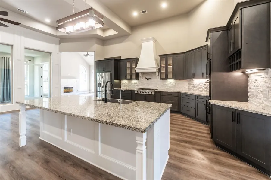 Welcome to the Elkins Lake lifestyle in this stunning, move-in-ready home located directly across from Camelia Lake. This spacious residence offers an open-concept floor plan with soaring 14-foot ceilings, abundant natural light, and modern finishes throughout. Enter through impressive wrought iron double doors into a large living area that flows into a showpiece kitchen featuring granite countertops, an oversized island, 36” gas cooktop, wall oven and microwave combo, farmhouse sink, and custom storage—perfect for entertaining.