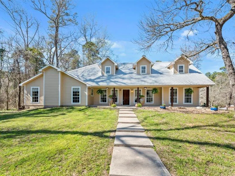 Lots of detail was put into the design of this Ranch style custom-built home nestled among the trees. Imagine your own farmhouse that sits on 8.13 acres & is conveniently located to the corridor between New Waverly & Huntsville & less than 30 minutes to the Woodlands. Large covered front porch welcomes you into the living room which has an 18 vaulted tongue-&-groove wood ceiling, wet bar, tile flooring & wonderful built-ins. Kitchen offers country charm with wood island/breakfast bar, granite, gas stove, butler pantry, pantry & dining area large enough for farmhouse table & sitting area. Plan offers split-level bedroom arrangement. Primary Ensuite BR/Bath is luxurious with dual walk-in closets, jetted tub, walk-in shower & accented with travertine tile & soap-stone sink with easy access to back deck. Bedrooms offer private areas w/ split-level having half-bath & Ample storage. 30x50 Barn w/ 3 stalls, chicken area, workshop & greenhouse. Stocked pond and much more!