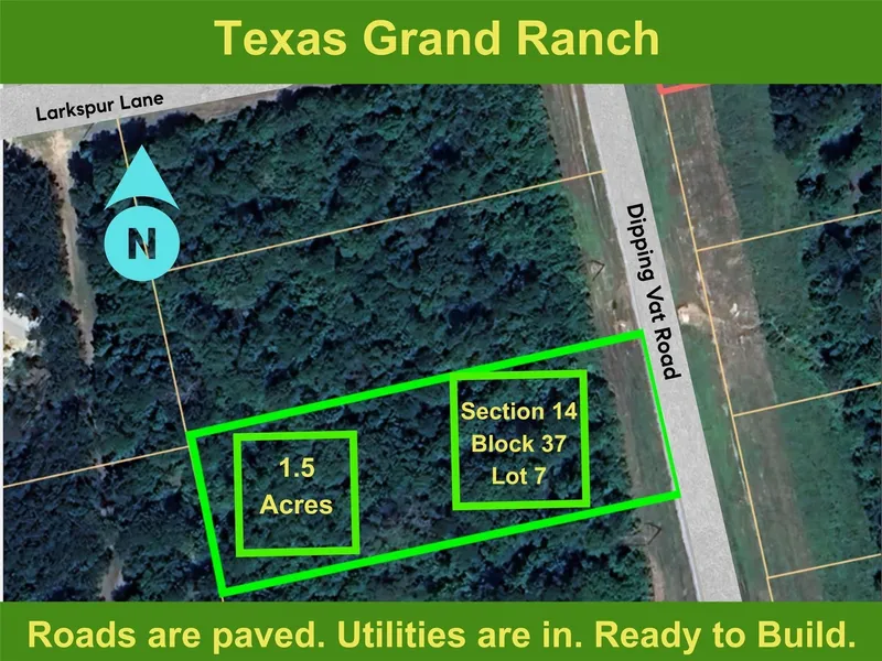 1.5 ACRES > NO EASEMENTS > CLOSE TO DIPPING VAT ENTRANCE > MATURE TREES WITH A MIX OF HARDWOODS > OLD ABANDONED RANCH ROAD RUNS THRU FOR EZ TOURING > Ready for peace & quiet & privacy? Ready to build. Start building whenever you want. Choose your own builder. EZ access to I-45. Texas Grand Ranch is a large lot, wooded community in the rolling hills. Country lifestyle for your custom forever home. Mature trees, paved roads, water & HIGH SPEED fiber optic internet. Covered pavilions, parks, ponds, playgrounds, BBQ areas. Minutes from shopping, dining, schools, hospitals, and entertainment. Low taxes - No MUD tax. HIGH & DRY - Average elevation is 325’ ASL. Surrounded by Nat’l Forest (161,508 acres) & State Park (2,083 acres) with 100’s of miles of hiking, biking and horseback riding – boat launches & beaches. Come home to Texas Grand Ranch.