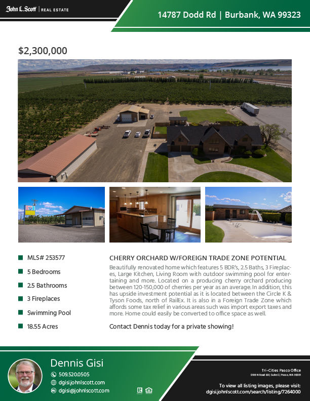 Set in a wonderful backdrop of 18.55 acres of a producing cherry orchard. These are of the Bing variety with Mansard & Gessler root stock. The orchard produces and average of 120-150,000 lbs. of fruit per year. In addition, the pollinizers are of the Rainier and produces on average between 30-50,000 lbs. There is 3 outbuildings. One has been a sales and marketing space for commuter or tourist traffic with a Cold Storage unit attached. Second is a ...
