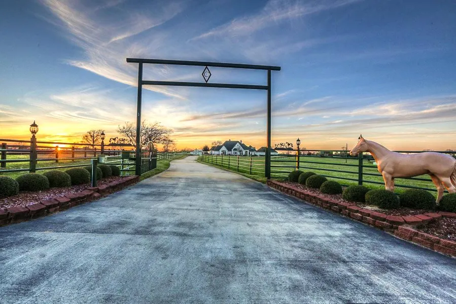 The property is fenced with pipe fencing with dramatic carriage lights sitting atop the posts. The lights, along with the fountain lights in the pond, create a beautiful glow in the evening. There are two automatic gates one at the road and one back by the barn with remote controls.The main house and pool are surrounded by a long concrete drive that turns and also leads to the barn.