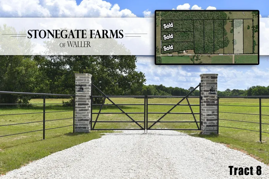 Tract #8 is 14.44 acres of land with a mixture of open terrain and tree cover. Scattered clusters of trees and gently sloped land provide several great homesites. The gated entrance includes gray stone and black pipe fencing. This parcel includes 422.04 ft. of road frontage along FM 362. Land is ready for your custom home, barn, family and animals! Low property taxes with agricultural exemption. G&W Water Supply Corp. and San Bernard Electric Co-op in the area. No HOA, dues or architectural control committee. Located 13 miles from downtown Waller, 28 miles to Cypress, and 55 miles to Houston. Stonegate Farms is a rural community providing secluded ranch style living with stone column and iron gated entrances, pipe fencing, paved road frontage and privacy. Owners will enjoy ample homesite locations, space to build, play, retire or expand horizons with a growing family. Property includes l...