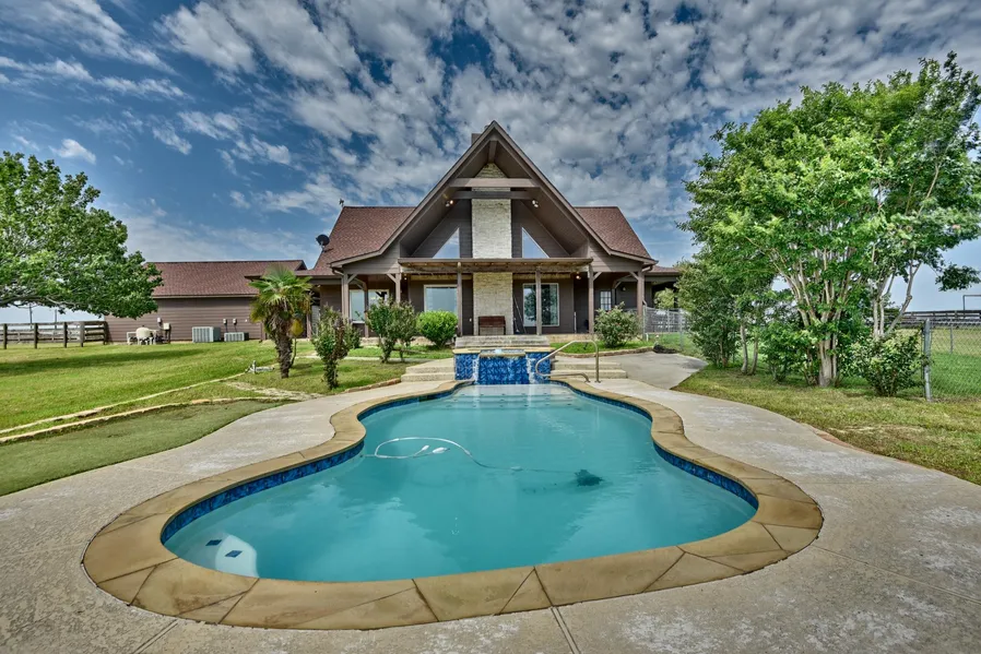 Welcome to Horseshoe Farm, where country charm meets modern luxury! Nestled on 13.87 acres of picturesque landscape, this stunning property at 24300 Stagecoach Road in Hempstead, TX offers a serene escape from the hustle and bustle of city life. Boasting a meticulously crafted custom ranch and lodge-style residence, this estate features 3 bedrooms, 2.5 bathrooms, and ample living space adorned with stone, granite, and wood features. The expansive outdoor oasis is great for family fun amongst the wrap-around porches, custom horseshoe shaped-spa, pool and putting greens. Additionally, the property includes 3 barns including one 6-stall horse barn with attached workshop and temperature-controlled storage/bathroom and 2 covered feed-bunk barns, all complete with turn-outs, cross-fenced pastures and paddocks. Property also includes 5 loafing sheds with cross-fenced pastures galore. Enjoy the ...
