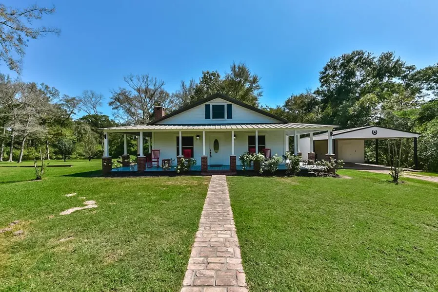 Unique 2bed/2bath home nestled on 1.31 acres! This charming home features a wrap around porch, Metal Roof, Spacious Living area w/ tiled floors, high vaulted ceilings & dual fans! Kitchen w/ updated hardware and island sits off dining area! Chair Rail & Wainscoting throughout! Bedrooms with private access to porch! Antique Vanity & Claw Foot Tub in Master Bath! Covered 2 car Carport w/ storage! Shed/Man Cave w/ Kitchenette & Bath can be converted into guest suite! Community Pool/Park/Lake!