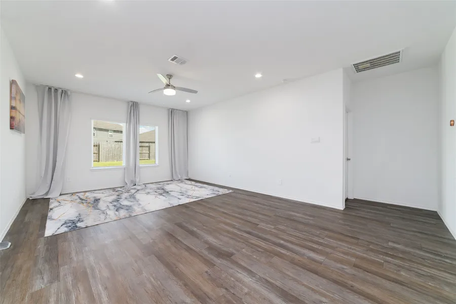 Two bedrooms and two full baths downstairs. Island kitchen with ample cabinetry and corner pantry opens to dining and a large living room. Privately located first-floor primary suite features a large shower and walk-in closet. Guest suite/second bedroom with adjoining full bath also downstairs. Upstairs offers a versatile game room and two generously sized secondary bedrooms. Covered patio included.