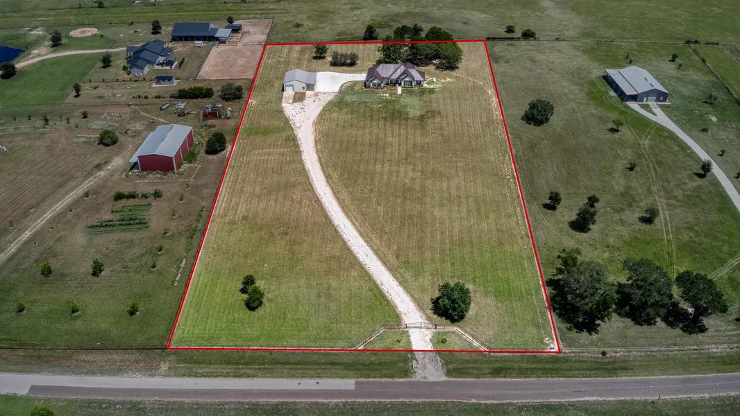NEW CONSTRUCTION! This beautiful never lived in home sits on top of hill on 5 acres in the desirable Spring Hill Estates. Home features stone exterior with low maintenance metal roof, gated entry, 500 gal propane tank, water well (230 ft), tankless water heater, solar window shades on all windows (Honeycomb, cordless lift) and soft closing cabinetry throughout home. Open floor plan with living room opening to Dining room and large kitchen with huge island with sink and breakfast bar. Entire perimeter pipe fencing, a 30x40 metal building with 12x40 covered porch. Landscaping with sodded grass completes the look of this gorgeous property. Gorgeous sunrises & sunsets. Just 10 minutes from Hwy 290 at Buc-ees.