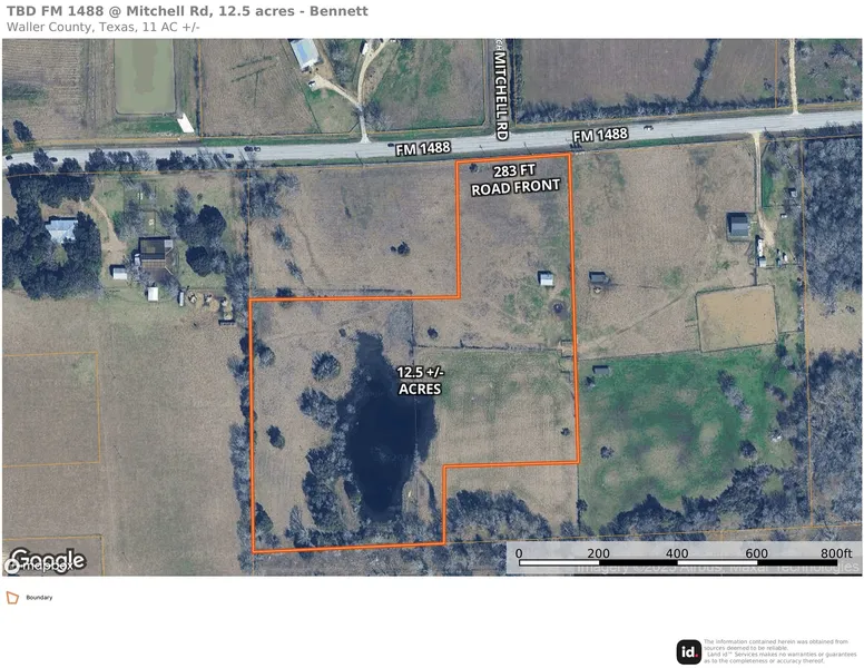 Approximately 12.5± acres with frontage along FM 1488 near Mitchell Rd in Waller County. The property offers ~283 feet of road frontage and a generally level configuration suitable for a variety of potential future uses, subject to buyer verification. Located between Prairie View and Hempstead with convenient access to US 290, providing connectivity to regional employment centers and established growth corridors. The surrounding area includes residential development, educational facilities, and expanding commercial and industrial activity along the US-290 corridor. Open pastureland with natural features, including a pond and tree lines, offering flexibility for site planning.